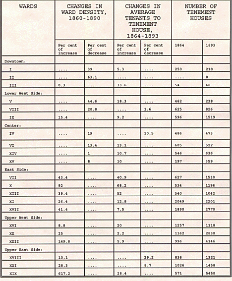 The tables show changes in general density of population in the different wards between 1860 and 1890, the character of dwellings in the wards and the percentage of population in them, changes in the average number of tenants to each tenant house between 1864 and 1893, and other data bearing upon the general question.